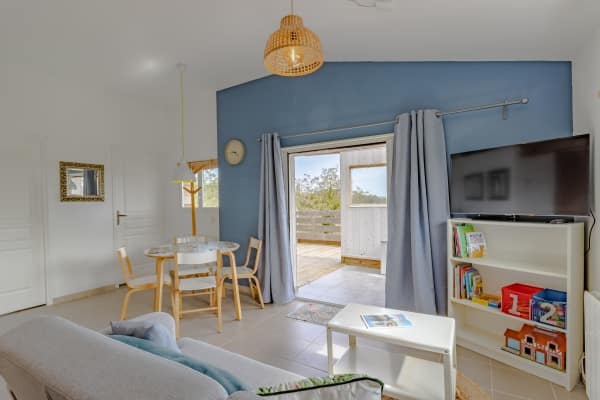 In de woonkamer staat een eettafel en bank. De open keuken is volledig uitgerust; 4-pits gasfornuis, koelkast met vriesvakje, oven, vaatwasmachine, servies, bestek en keukengerei. Ook zijn er een waterkoker en een capsule-koffieapparaat (Philips l’Or).